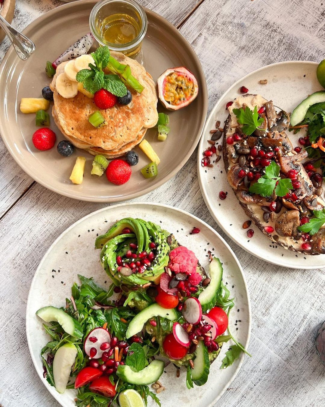 Modernes Café mit internationalem Brunch und gemütlicher Atmosphäre.