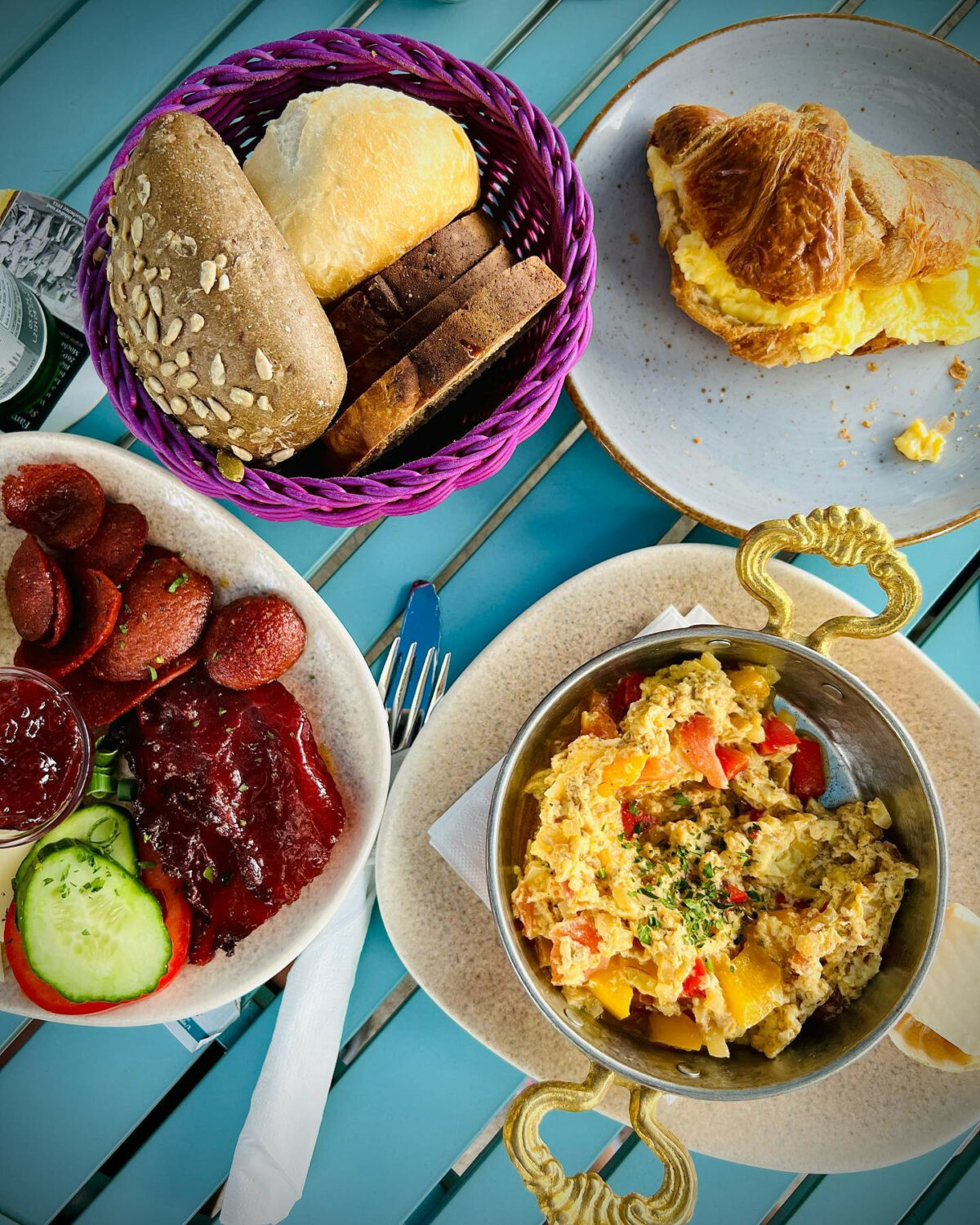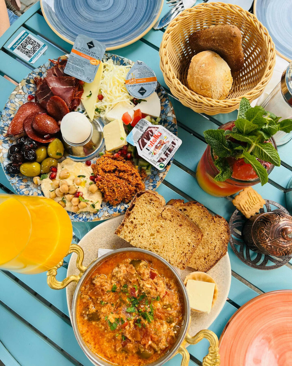 Leckeres Frühstück, diverse Kuchen und internationale Gaumenfreuden wie Hummus oder Börek.