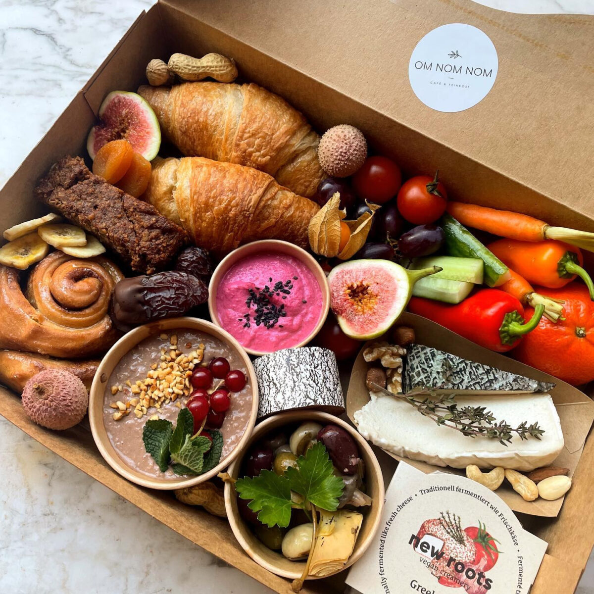 Im OM NOM NOM gibt es Frühstück, Mittagessen sowie Kaffee und Kuchen. Besonders: die vegane Käsetheke, etwa mit Cashew-Camembert, und die hausgemachten fermentierten Getränke wie Kombucha.