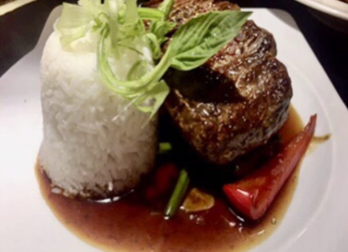 knuspriges Entenfilet in pikanter hausgemachter süßsauer-scharfer Chilisauce und Gemüse sowie das „Roastbeefsteak