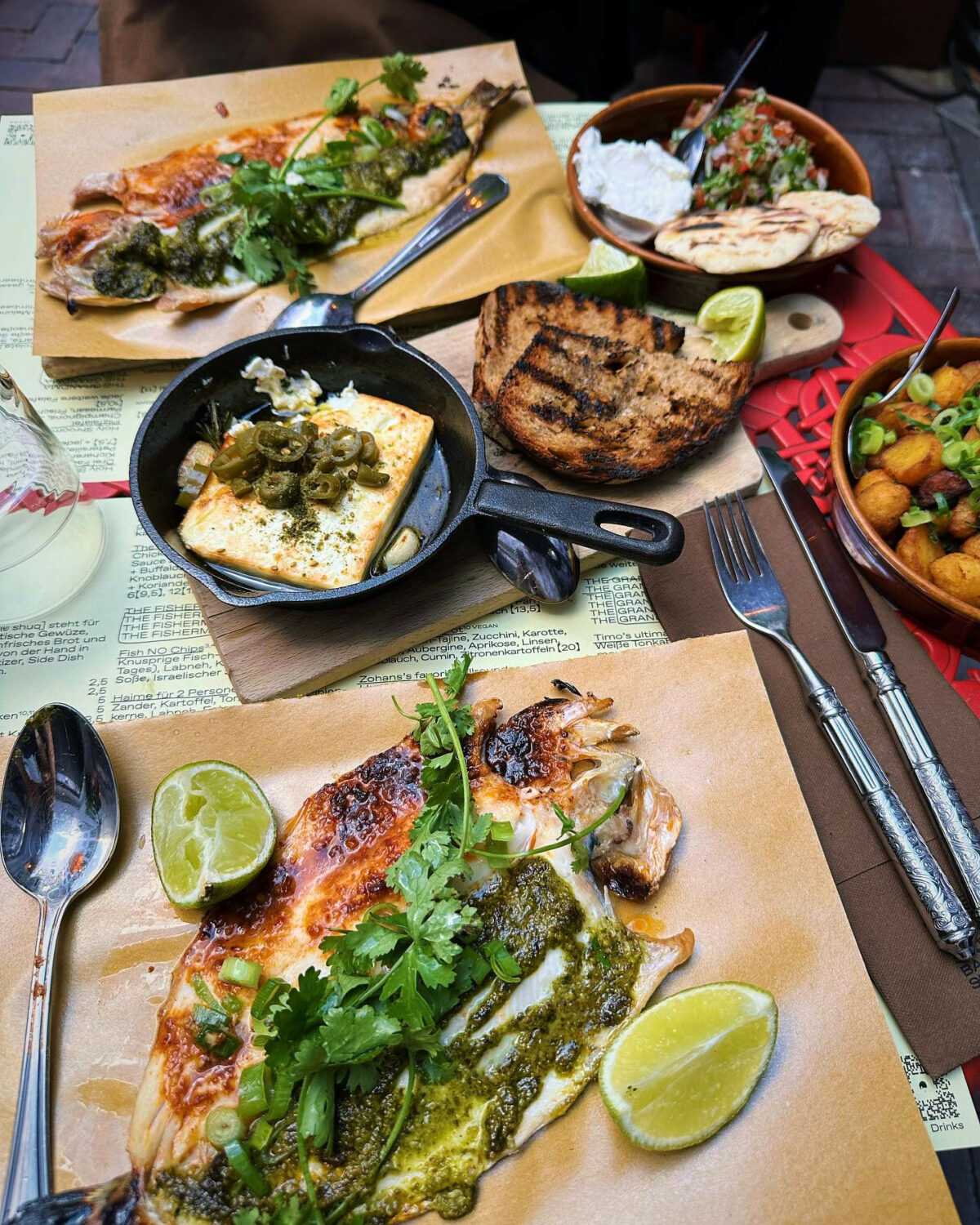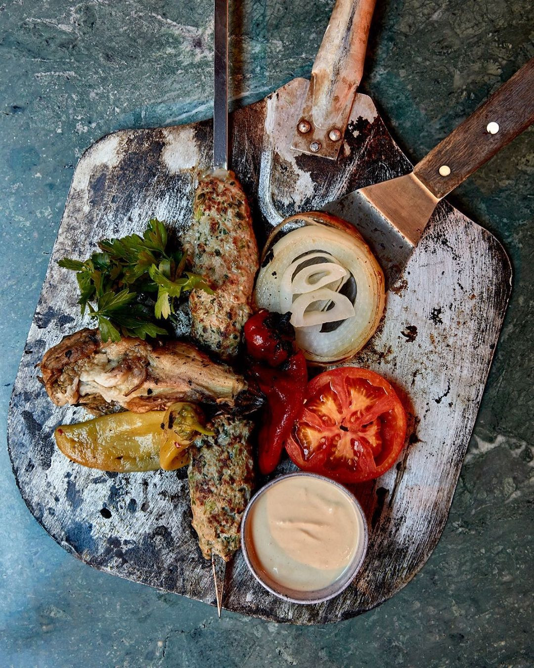 Frisches Pitabrot aus dem Ofen, Jerusalem-Kebap auf offenem Feuer, Grüne Soße aus Mittelmeerkräutern, eine Showküche und ein bisschen Chaos.