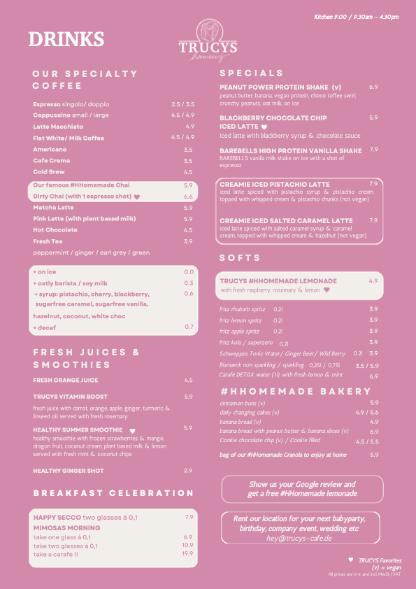 Unsere TRUCY verwöhnt euch mit den leckersten Smoothie Bowls & Cinnamon Rolls der Stadt. Jeden Tag kreiert unsere liebe Yasmin eine große Auswahl von #HHomemade Cakes – meist vollständig Vegan. Schwebt ihr auf Wolke 7? Unser Pancake Heaven wird euch auf Wolke 10 schweben lassen. Ihr mögt es herzhaft? Huii, wir haben unsere leckeren Breakkys – Brioche mit Avocado, Rührei, Cheddar & unsere #HHomemade Mayonnaise – oder doch lieber ein leckeres Brot mit veganem Frischkäse, saftigen Avocadoscheiben, Rührei und Burrata? Zudem gibt es leckere Kaffeespezialitäten, frische Smoothies & cremige Shakes zubereitet von unserem Star-Barista Alex. Ach, und #HHomemade Lemonade, Cocktails & leckeren Wein gibt es auch. TRUCY & das ganze Team freut sich auf Euch!