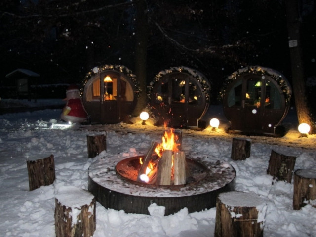 In den Fässern finden bis zu 8 Personen Platz und sind somit der ideale Ort für ungestörte Feiern und Gespräche. Im stilvollen Ambiente, mit Blick aufs Lagerfeuer und genussvoller deutscher Küche ist ein außergewöhnlicher Abend mit Freunden oder Familie garantiert.